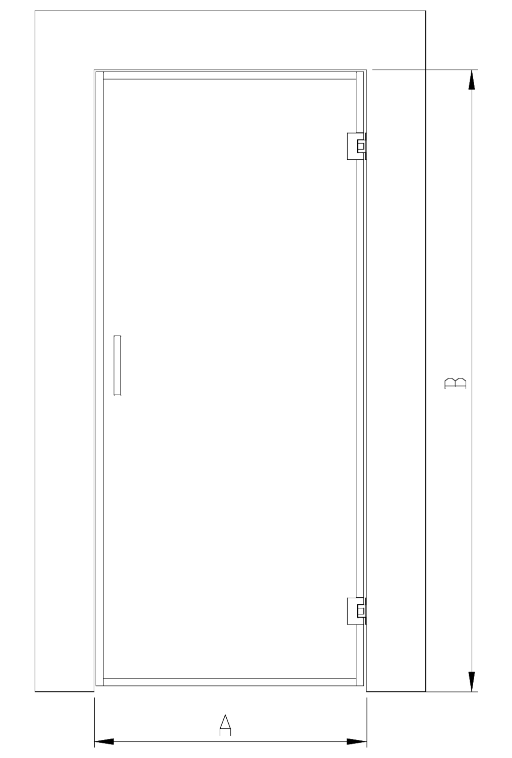 The door is always manufactured with custom dimensions. When selecting the size, the width is the width of the installation opening. The height is entered as doorglass + 25 mm, leaving a 20 mm gap below the door and 5 mm above it. When dimensioning the door for a sauna, B should be the actual gap - 90 mm, leaving 110 mm below the doorpanel. If the size of the door exceeds 1.7m2 an additional hinge is necessary to provide additional support.