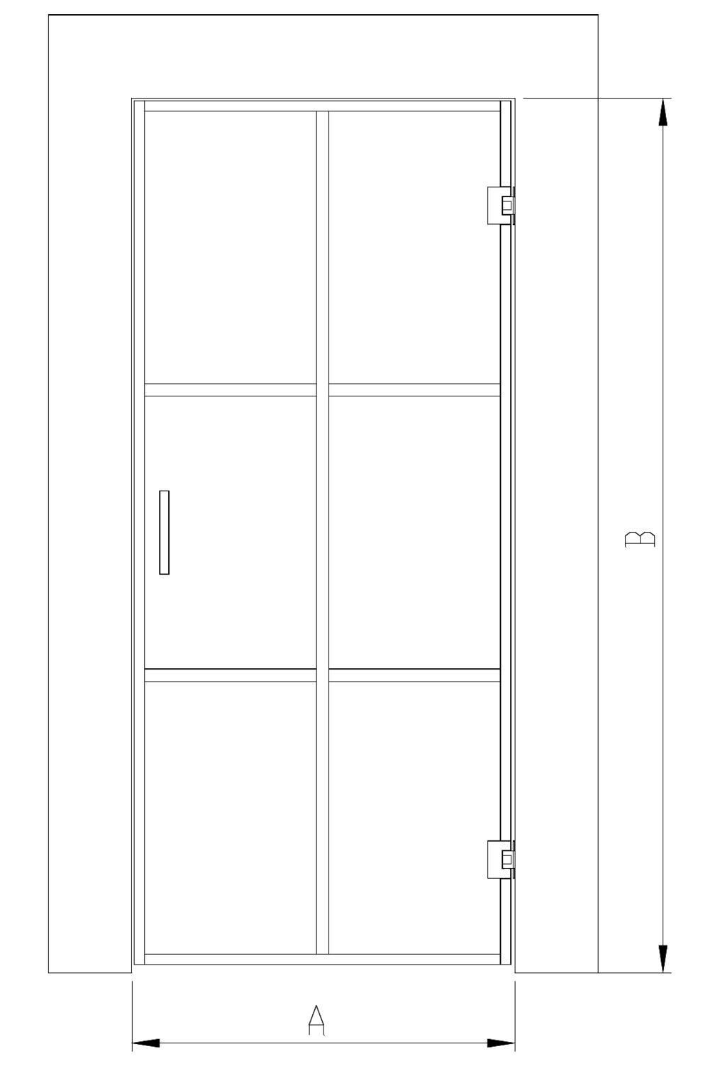 The door is always manufactured with custom dimensions. When selecting the size, the width is the width of the installation opening. The height is entered as doorglass + 25 mm, leaving a 20 mm gap below the door and 5 mm above it. When dimensioning the door for a sauna, B should be the actual gap - 90 mm, leaving 110 mm below the doorpanel. If the size of the door exceeds 1.7m2 an additional hinge is necessary to provide additional support.