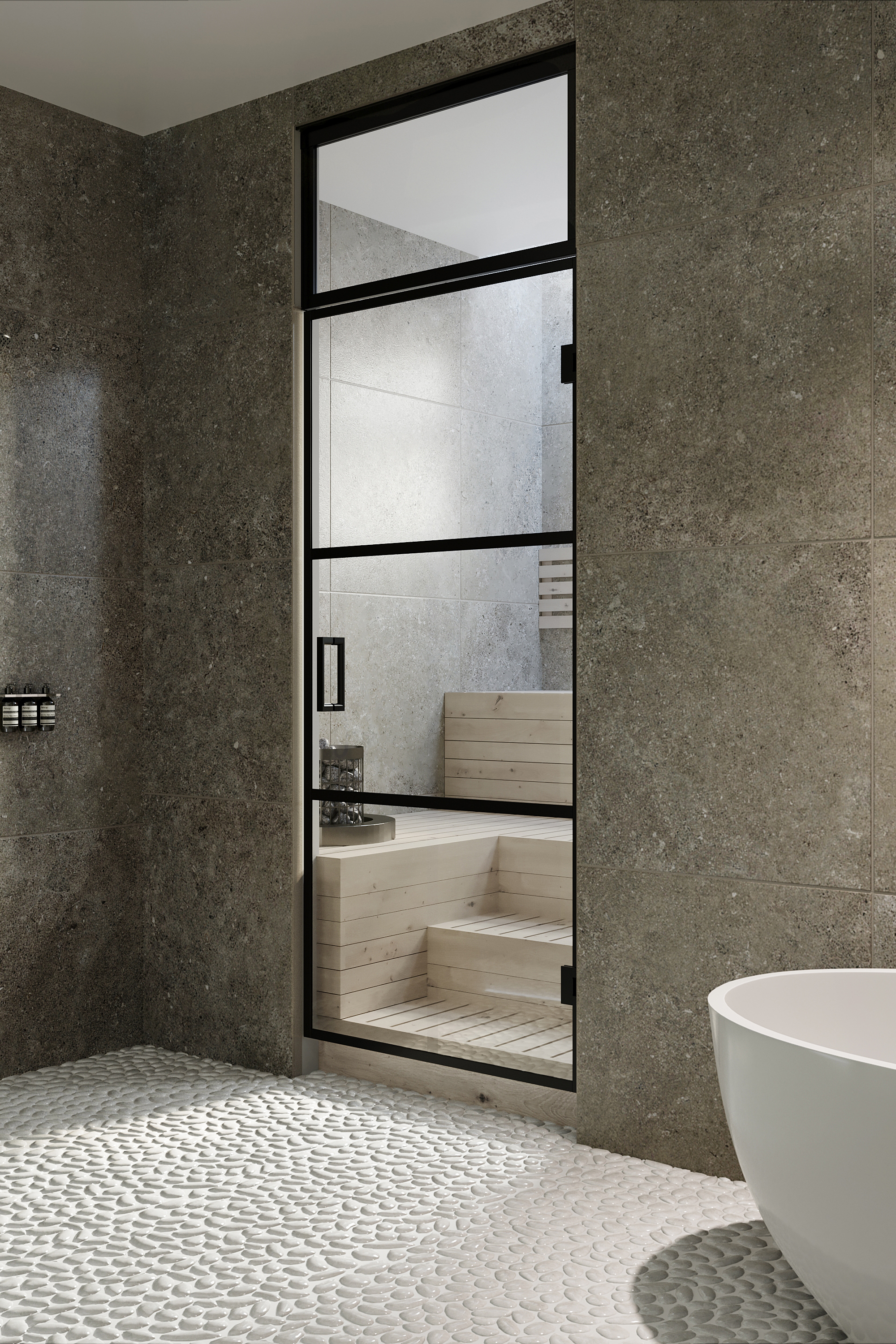 The hinges of the glass door are mounted directly to the building wall. Installation guide