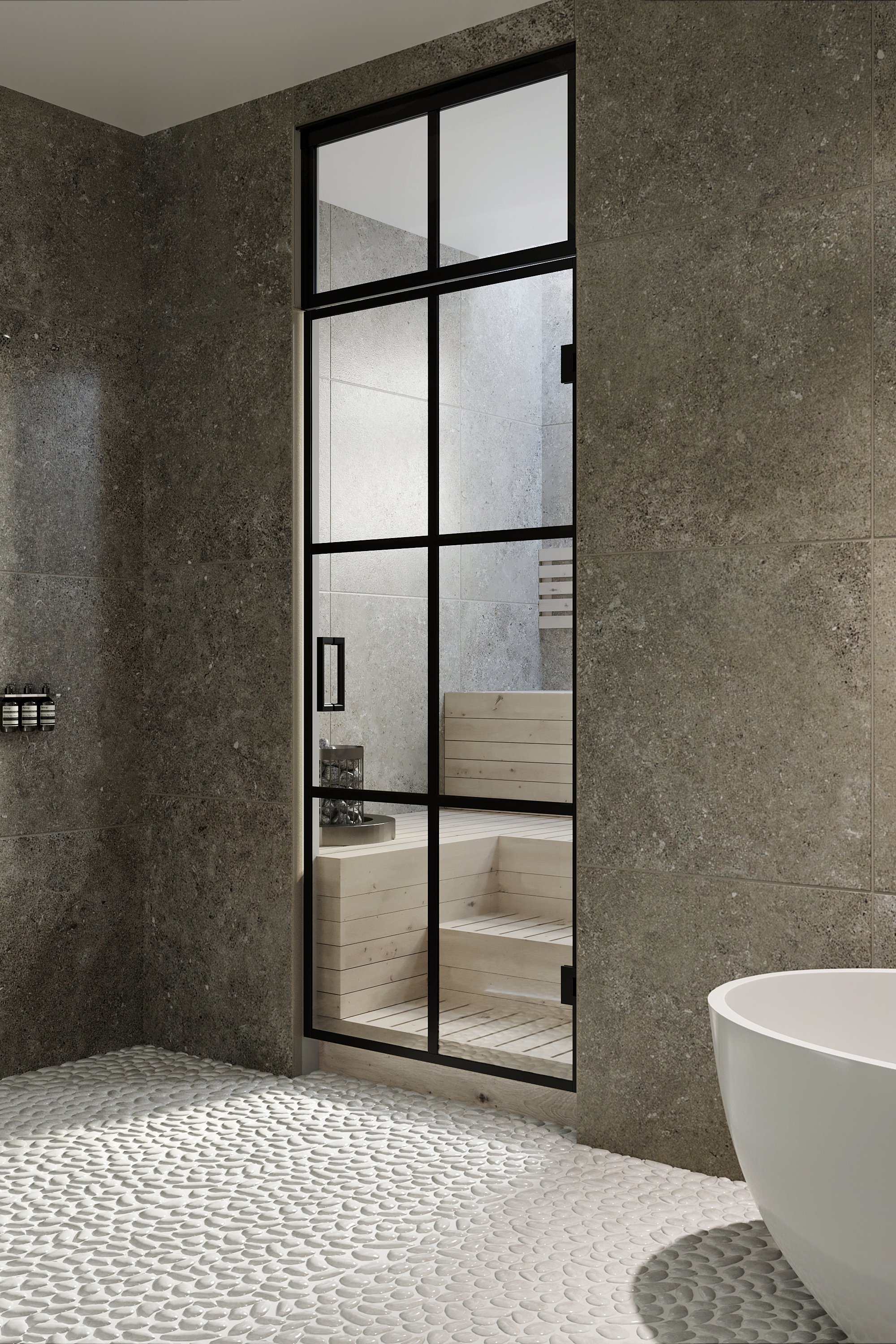 The hinges of the glass door are mounted directly to the building wall. Installation guide
