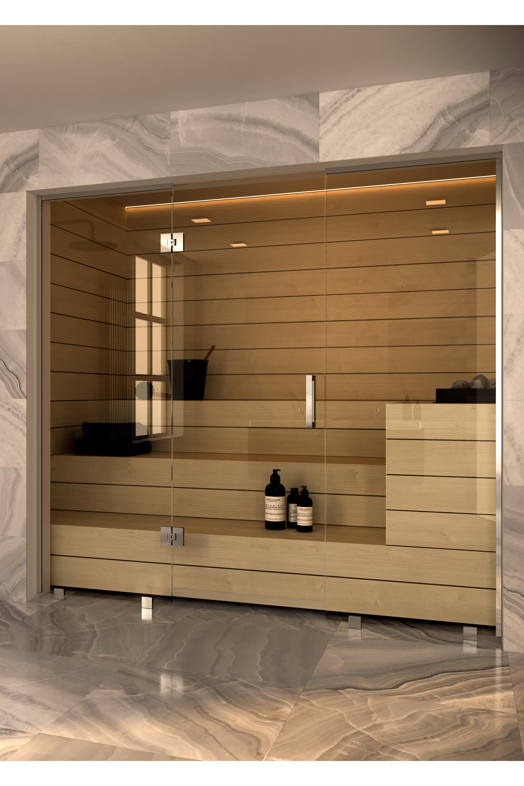 The product is suitable for sauna space division. The door does not have any frames, the hinges are mounted directly to the side panel on the hinge side. The side panels add light and the feeling of spaciousness to the space.