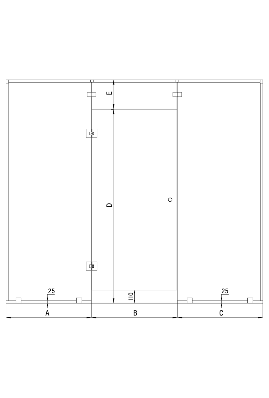 The size of the shower door can be selected from the standard dimensions (700/800/900 x 2000) or it can be manufactured by special dimensions; the upper and the side panels are always manufactured by special dimensions. When selecting the size of the door and the upper panel, the width is the width of the installation opening and the height is the height of the panel pane. When dimensioning the height of the installation opening of the door, a 5mm reserve is automatically left at the top edge of the panel and a 110mm reserve is left at the bottom edge. When selecting the side panels, the width and the height are the width and the height of the installation opening. Installation and adjustment ranges are included automatically in the dimensioning of the panel panes of the side panels.If the size of the door exceeds 1.7m2 an additional hinge is necessary to provide additional support.