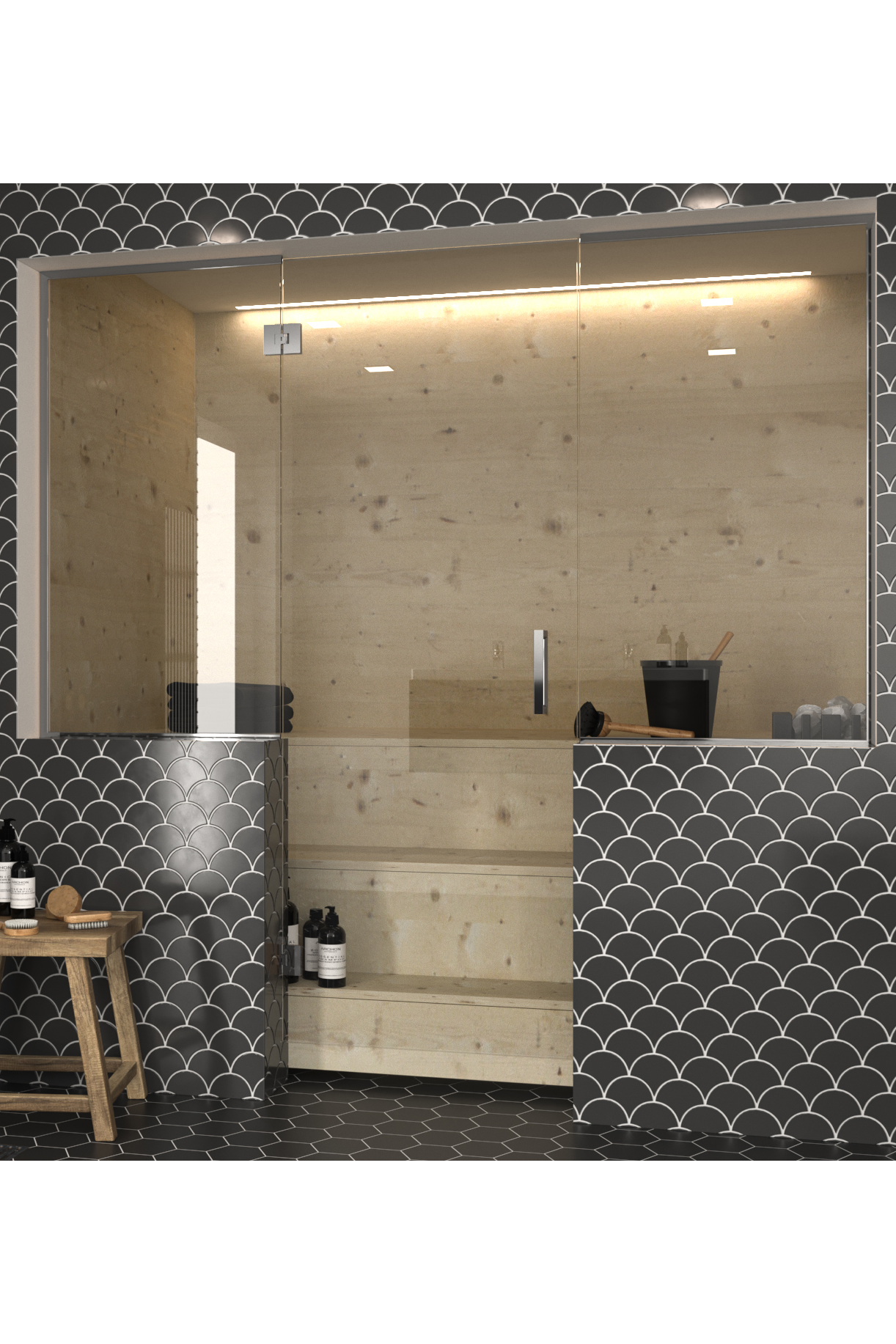 The product is suitable for sauna space division. The door does not have any frames, the hinges are mounted directly to the side window as well as the building wall below. The side panels add light and the feeling of spaciousness to the space.