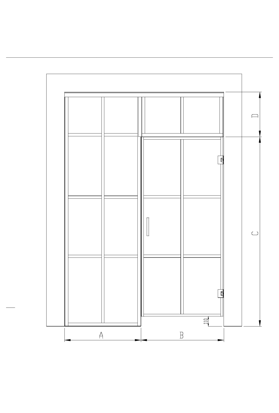 Sauna doors are always made to measure. When selecting the size of the door and the upper panel, the width is the width of the installation opening and the height is the height of the panel pane. When measuring the height of the installation opening of the door, a 5mm reserve is automatically left at the top edge of the panel and a 110mm reserve is left at the bottom edge. When selecting the side panels, the width and the height are the width and the height of the installation opening. Installation and adjustment ranges are included automatically in the dimensioning of the panel panes of the side panels. If the size of the door exceeds 1.7m2 an additional hinge is necessary to provide additional support.
