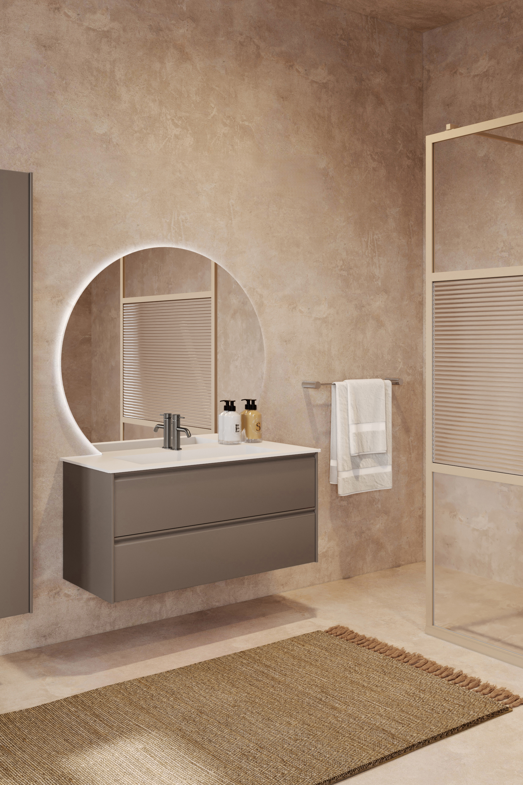 Cabinet color options are matt greige, matt white and matt grey.