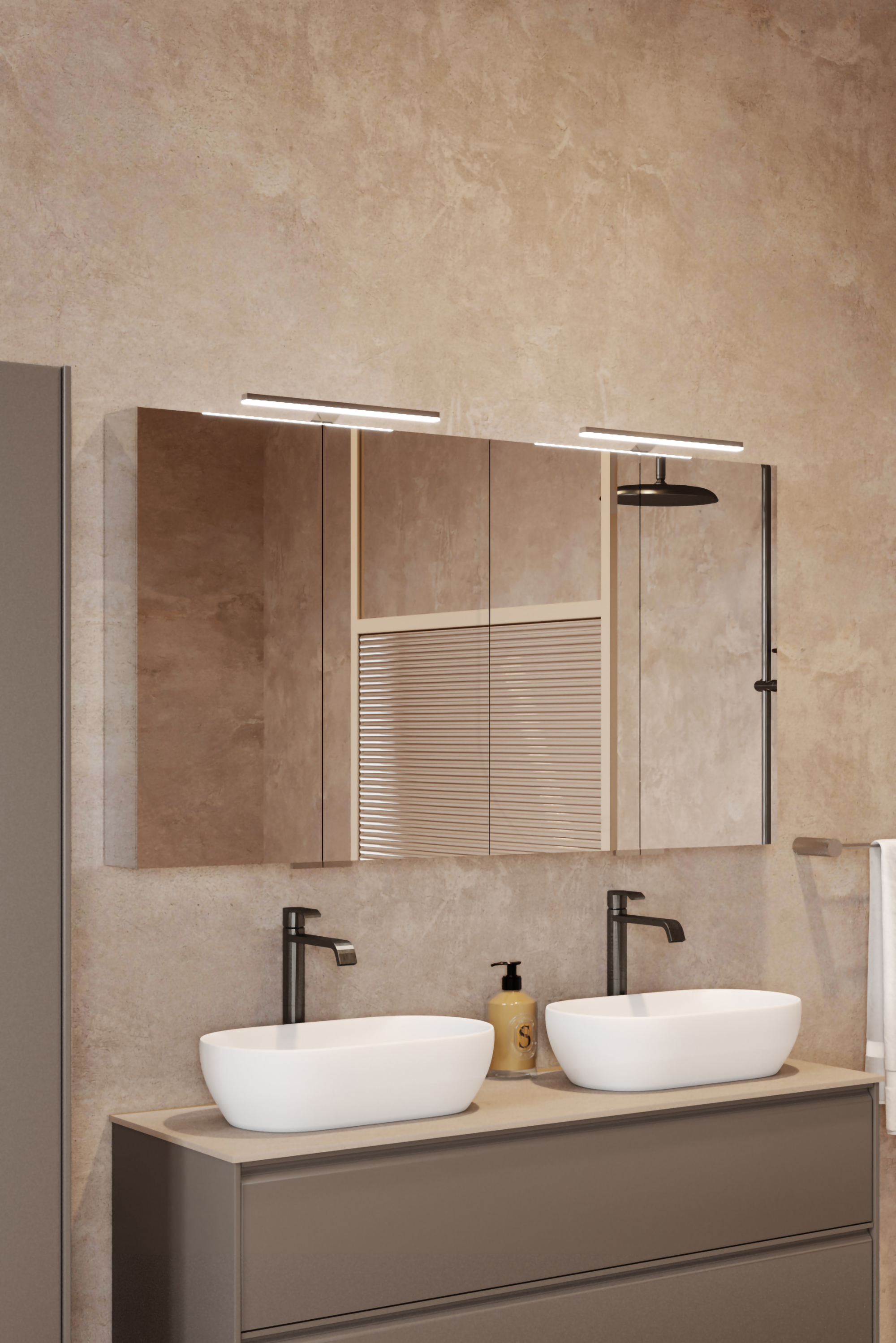 Mirror cabinet is installed on building wall with screws. Installation height can be freely chosen. Mirror cabinet electrical parts are IP44 compliant.