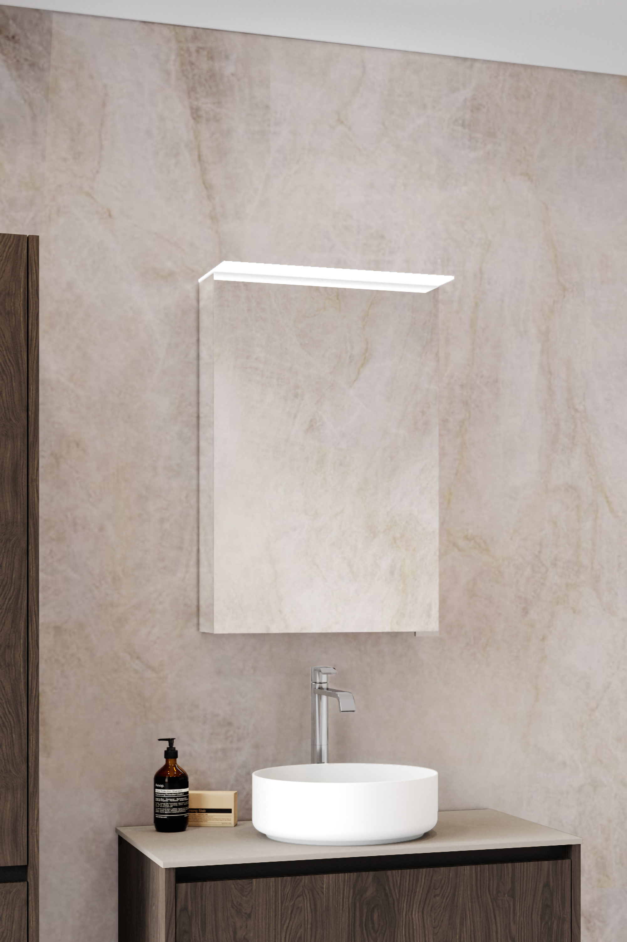 Mirror cabinet is installed on building wall with screws. Installation height can be freely chosen. Mirror cabinet electrical parts are IP44 compliant.