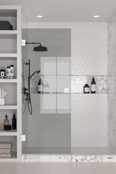 Glasvägg med fasta paneler på gångjärnssidorna, pardörr och övre fönster