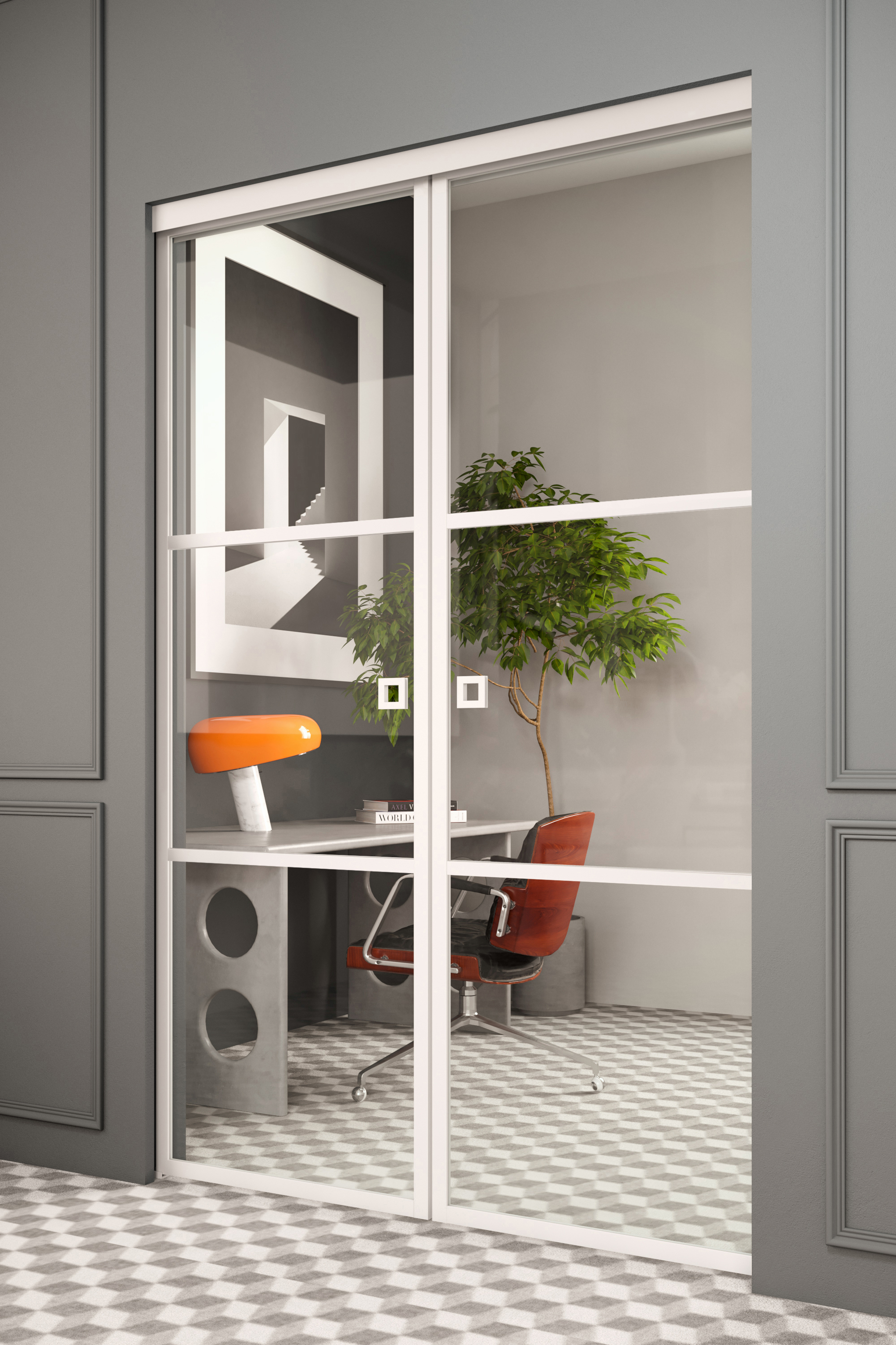 Double pocket doors consists of two sliding glass door and sliding- and maintenance rails mounted to the top of the gap, to the ceiling. Both doors slide inside the wall on the rail which continues into the wall fixtures on both sides. A high quality sliding mechanism, as well as floor guide fittings provide smooth and safe door movements. The doors are equipped with one soft closing mechanism each, which cushions the closing and gently pulls the doors into their closed position.