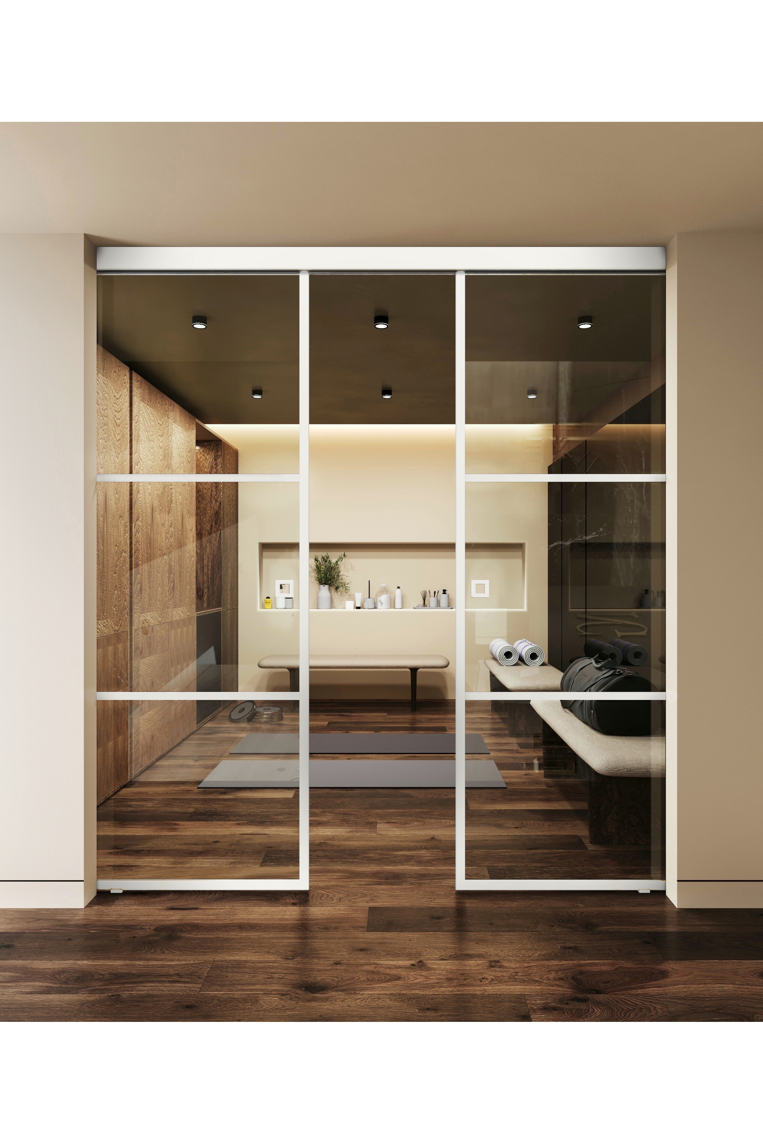 The sliding double door glass wall consists of two sliding door panels and a sliding mechanism mounted to the building wall above the doorway. Sliding door fixture takes up very little space in the room, a quality sliding mechanism and a floor guide fitting provides a smooth and safe door movement. The doors are equipped with soft closing mechanism which cushions the closing and gently pulls the door into position.