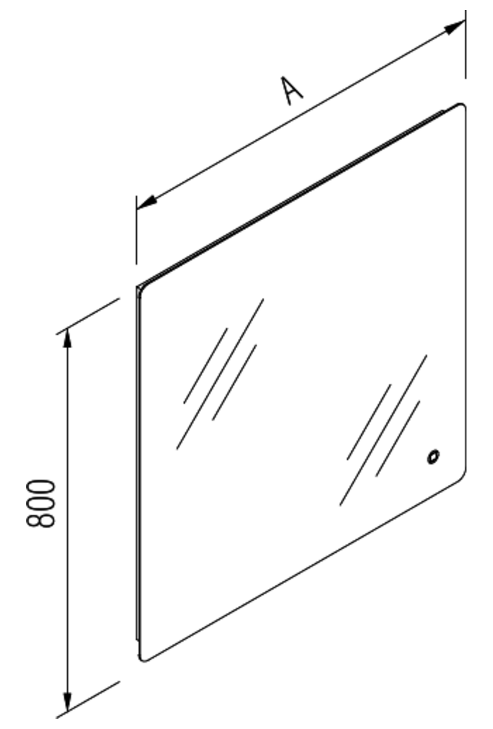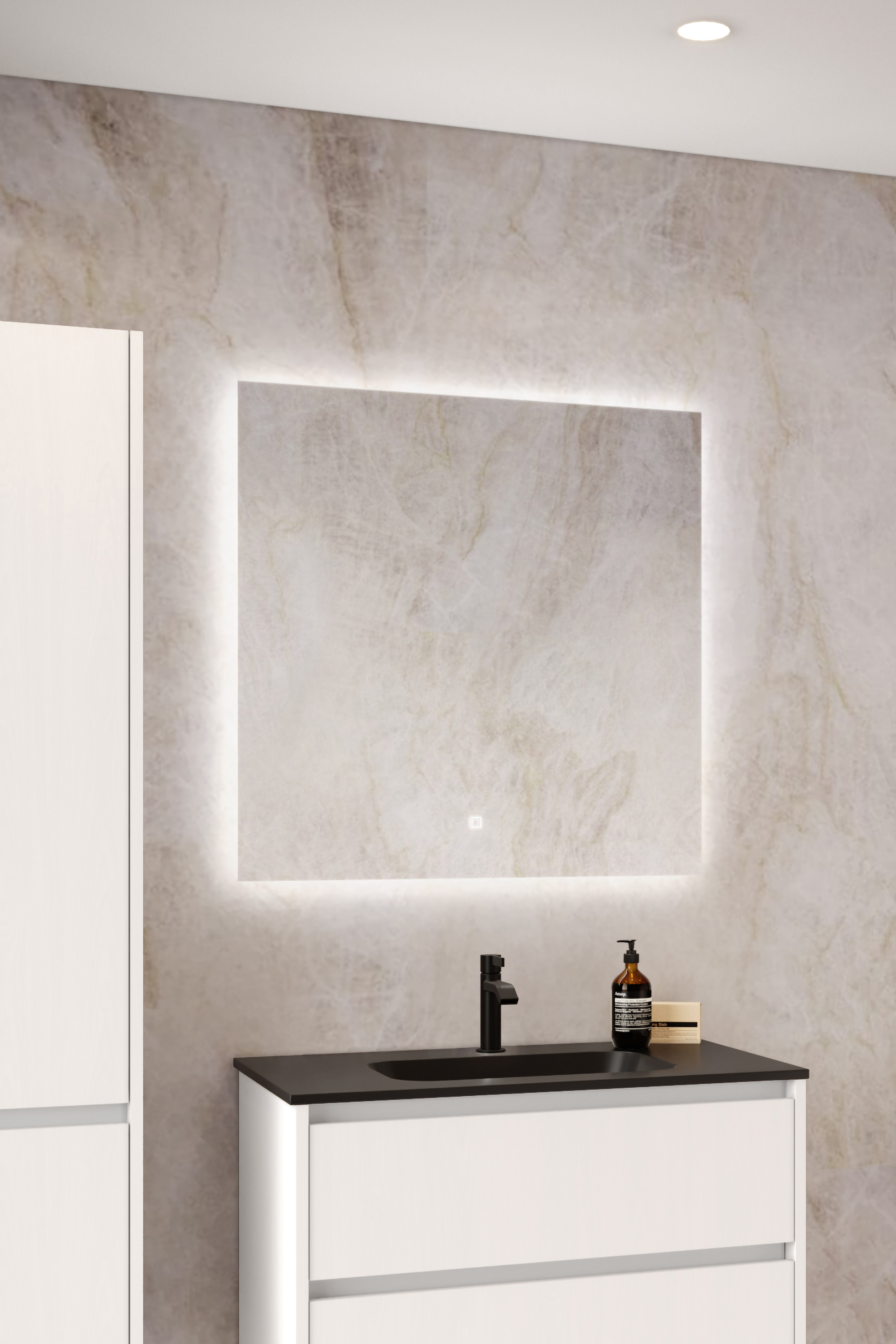 Rectangular mirror has an ambient lighting, of which color temperature and intensity can be tuned. Color temperature tuning range is 2700-6500K.
