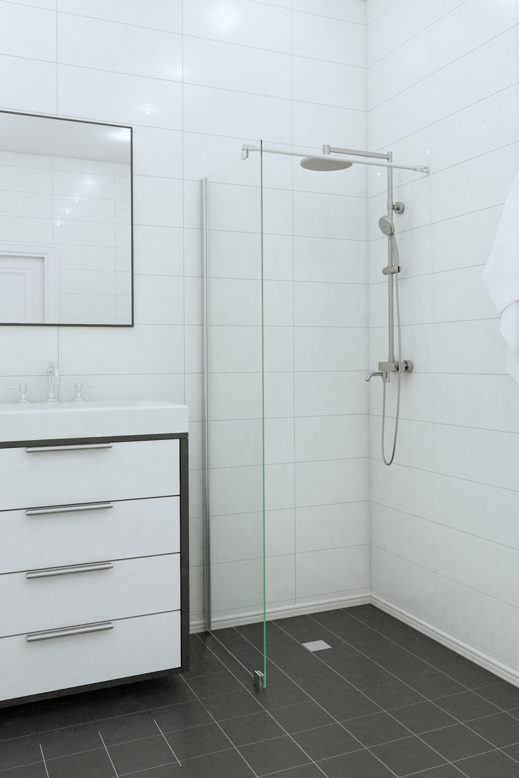 Shower screen is attached by its sides to the building wall with a wall mounted profile. The panel is supported from the upper edge by a round supportrod which is mounted at a 90 degree angle between the glass and the building wall. The panel is supported from the bottom edge by a fitting glued to the floor, which means that there will be a 25mm gap between the panel and the floor. Between the panel and the floor a seal (standard part) may be installed, in order to prevent water from flowing under the panel. Installation guide