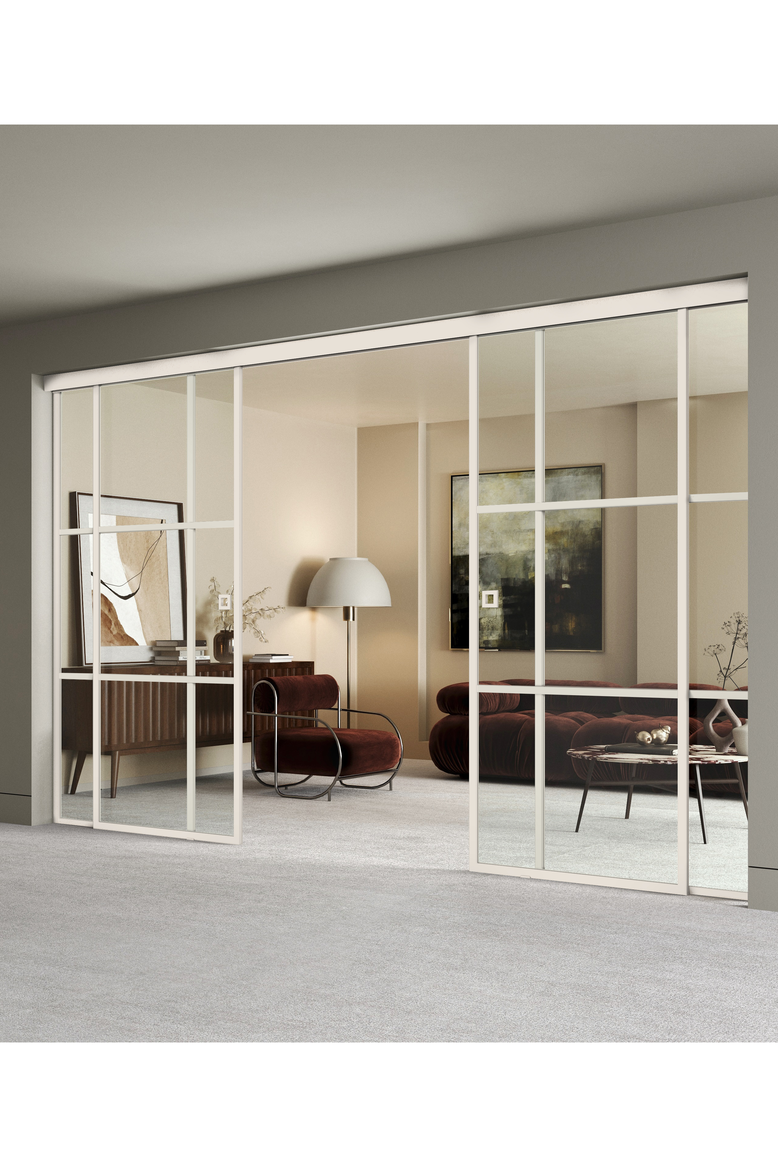 Kahdella kiinteällä osalla varustettu liukuva pariovi koostuu kahdesta liukuvasta lasiovesta, kahdesta kiinteästä lasilevystä ja liukumekanismeista. Liukuovikiinnitys vie huoneesta vain vähän tilaa, ja laadukas liukumekanismi sekä lattiaohjain takaavat sujuvan ja turvallisen oviliikkeen. Ovet on varustettu hidastimella, joka vaimentaa sulkemista ja vetää oven varovasti paikalleen.