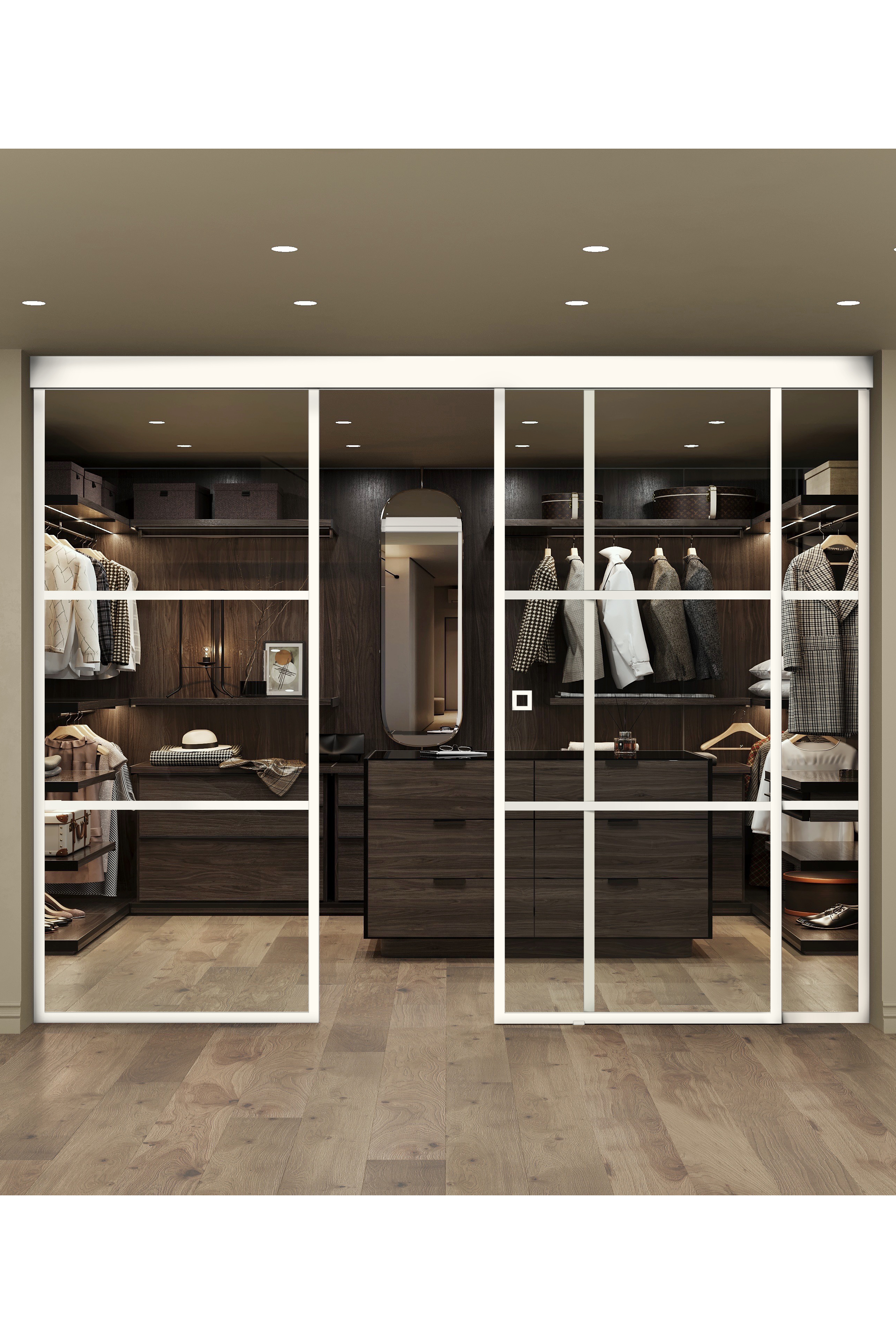 Dubbel skjutdörr med soft closing-mekanism och två fasta paneler